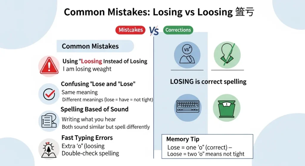 โLosingโ and โloosingโ may look similar, but they have very different meanings. โLosingโ is the correct word when you talk about not having something anymore, failing, or something going away. It is widely used in daily life, exams, and professional writing.